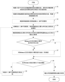 5.根据权利要求4所述的卫星平台多星敏感器姿态自适应融合方法,其特征在于,所述步骤S5中构建的Helmert方差分量估计模型为:其中S表示各类观测值的估计方差系数阵,Sii表示S的对角线部分,Sij表示S的非对角线部分,j=1,2,...,n, 表示待估计参数,W表示各类观测值改正数的平方和, 表示第i类观测值的单位权方差估计值。