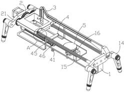 所述第一复位组件(41)包括第三滑杆(411)、挡板(412)和第二弹簧(413),所述第三滑杆(411)与所述U形架(1)滑动配合,且所述辊轮(42)设置在所述第三滑杆(411)的顶端,所述挡板(412)设置在所述第三滑杆(411)的底端,所述第二弹簧(413)套设在所述第三滑杆(411)上,所述第二弹簧(413)的顶端与所述U形架(1)的底部固定连接,第二弹簧(413)的底端与所述挡板(412)固定连接,所述第三滑杆(411)上开设有第二卡槽(17),所述第一楔形块(463)与所述第二卡槽(17)相适配;