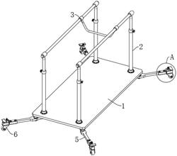 1.脑瘫综合康复训练辅具,包括支撑底板(1),其特征在于:所述支撑底板(1)的顶部对称安装有训练双杠(2),所述训练双杠(2)的两侧横杆之间安装有扶手组件(3),所述支撑底板(1)的底部四角均固定有支撑轴杆(4),所述支撑轴杆(4)的外壁套设有旋转展臂(5),所述旋转展臂(5)的外端设置有用于支撑底板(1)移动以及固定的移动稳定组件(6),所述支撑底板(1)的底部设置有与移动稳定组件(6)相配合的吸附磁铁(7)。