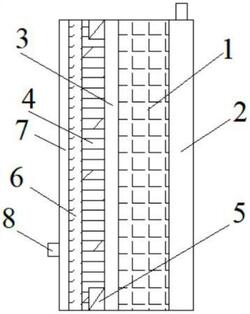 1.温室大棚取暖墙,其特征在于,包括墙主体(1)、蓄热层(2)、第一绝缘涂料层(3)、吸热导电涂料层(4)、导电铜带(5)、远红外放热涂料层(6)、第二绝缘涂料层(7)和温度传感器(8),所述墙主体(1)的外侧固定有蓄热层(2),所述墙主体(1)的内侧设有第一绝缘涂料层(3)、吸热导电涂料层(4)、远红外放热涂料层(6)和第二绝缘涂料层(7),所述第一绝缘涂料层(3)、吸热导电涂料层(4)、远红外放热涂料层(6)和第二绝缘涂料层(7)由室外到室内方向依次连接固定设置,在所述吸热导电涂料层(4)的内部设有与外部电源电连接的导电铜带(5)。