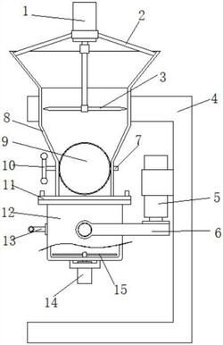 1.一种畜牧兽医用中草药粉粹装置,包括固定架(4),其特征在于:所述固定架(4)外部固定安装有筒体(8)和电动推杆(5),所述筒体(8)顶部固定安装有支撑架(2),所述支撑架(2)顶部固定安装有第一电机(1),所述第一电机(1)的电机轴固定安装有粉碎刀杆(3),所述筒体(8)内壁贯穿安装有轴杆(7),所述轴杆(7)外部固定安装有调动柄(10),所述轴杆(7)中部固定安装有圆盘(9),所述筒体(8)底部固定安装有安装环(11),所述安装环(11)外壁开设有限位孔(18),所述电动推杆(5)外部固定安装有安装架(6),所述安装架(6)内壁铰接安装有粉碎筒体(12),所述粉碎筒体(12)顶部表面固定安装有限位柱(17),所述限位柱(17)内壁底部固定安装有研磨刀杆(15),所述粉碎筒体(12)外部固定安装有握柄(13)和第二电机(14)。2.根据权利要求1所述的一种畜牧兽医用中草药粉粹装置,其特征在于:所述圆盘(9)的侧壁固定安装有橡胶环(16)。3.根据权利要求1所述的一种畜牧兽医用中草药粉粹装置,其特征在于:所述粉碎刀杆(3)和圆盘(9)均位于筒体(8)的内部,粉碎刀杆(3)位于圆盘(9)的正上方。4.根据权利要求1所述的一种畜牧兽医用中草药粉粹装置,其特征在于:所述粉碎筒体(12)的限位柱(17)与安装环(11)的限位孔(18)镶嵌连接。5.根据权利要求1所述的一种畜牧兽医用中草药粉粹装置,其特征在于:所述第二电机(14)的电机轴与研磨刀杆(15)的底部相连接。