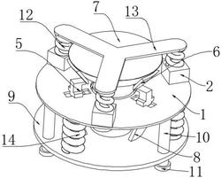 所述电机(2)的上侧固定焊接有第一弹簧(12),三个所述第一弹簧(12)的上侧固定焊接有压条(13),且所述压条(13)位于滑动盘(7)的上侧,所述基板(1)与所述滑动板(9)之间均布固定焊接有三个第二弹簧(14)。