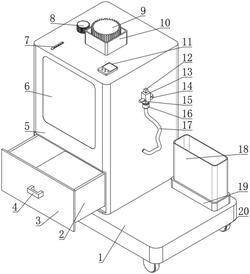 1.一种呼吸科护理用雾化喷药装置,包括底板(1),其特征在于:所述底板(1)顶部固定连接有壳体(5),所述壳体(5)内部固定连接有支撑板,所述壳体(5)顶部固定连接有电机架(10),所述电机架(10)内固定连接有驱动电机(9),所述驱动电机(9)输出轴固定连接有转轴(21),所述转轴(21)通过轴承套接在支撑板顶部,所述转轴(21)表面固定连接有搅拌块(22);支撑板顶部固定连接有水泵(26),所述水泵(26)一端固定连接有输液软管(17),所述水泵(26)另一端固定连接有输液硬管(27),所述输液硬管(27)内部设置有过滤网,所述输液软管(17)一端固定连接有连接组件(16),所述壳体(5)一侧固定连接有限位架(14),所述限位架(14)表面设置有扶手(15),所述扶手(15)一侧固定连接有横箱(13),所述横箱(13)底部固定连接在连接组件(16)一端。2.根据权利要求1所述的一种呼吸科护理用雾化喷药装置,其特征在于:所述连接组件(16)包括第一连接口(161)和第二连接口(163),所述第一连接口(161)和第二连接口(163)分别固定连接在横箱(13)底部和输液软管(17)顶端,所述第一连接口(161)表面开设有卡槽(162),所述第二连接口(163)内侧固定连接有卡块(164),所述卡块(164)卡接在卡槽(162)内部。3.根据权利要求1所述的一种呼吸科护理用雾化喷药装置,其特征在于:所述壳体(5)底部开设有滑槽(28),所述滑槽(28)内滑动连接有滑块(29),所述滑块(29)顶部固定连接有收纳箱(2),所述收纳箱(2)一侧固定连接有弹簧(25),所述弹簧(25)一端固定连接在壳体(5)内部一侧,所述收纳箱(2)另一侧固定连接有挡板(3),所述挡板(3)一侧连接有把手(4)。4.根据权利要求1所述的一种呼吸科护理用雾化喷药装置,其特征在于:所述底板(1)顶部固定连接有放置槽(19),所述放置槽(19)内部固定连接有集废箱(18),所述壳体(5)顶部开设有进水口,进水口表面螺纹连接有壳盖(8)。5.根据权利要求1所述的一种呼吸科护理用雾化喷药装置,其特征在于:所述底板(1)底部固定连接有万向轮(20),支撑板顶部固定连接有保护壳(23),所述保护壳(23)内固定连接有加温器(24),所述壳体(5)内部一侧固定连接有温度感应器,所述壳体(5)顶部固定连接有温度表(7),所述壳体(5)表面固定连接有观察窗(6)。6.根据权利要求1所述的一种呼吸科护理用雾化喷药装置,其特征在于:所述壳体(5)顶部固定连接有操控面板(11),所述操控面板(11)与驱动电机(9)、加温器(24)、温度感应器和水泵(26)均通过导线电性连接。