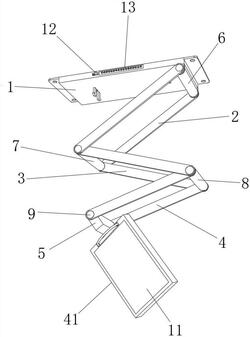 所述顶壳(1)的底部后端左右侧分别固定连接在第一轴套(601)的一侧左右端,所述第一轴杆(602)的两端均固定连接在第一折叠架(2)的一端,所述第一折叠架(2)的另一端分别固定连接在第二轴杆(702)的两端,所述第二轴套(701)的一侧左右端均固定连接在第二折叠架(3)的一端,所述第二折叠架(3)的另一端分别固定连接第三轴杆(802)的两端,所述第三轴套(801)的一侧左右端均与第三折叠架(4)的一端固定连接,所述第三折叠架(4)的另一端分别固定连接在第四轴杆(902)的两端,所述第四轴套(901)固定连接在端块(5)的前端;