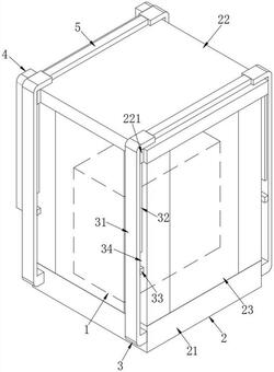 1.一种干式电力变压器,其特征在于:包括变压器主体(1)和外防护组件(2),所述外防护组件(2)包括底座(21)、防护顶盖(22)和侧护板(23),所述变压器主体(1)固定连接在所述底座(21)顶部,所述底座(21)外壁固定连接有四个定位安装组件(3),四个所述定位安装组件(3)两两对称分布,所述定位安装组件(3)包括定位板(31)、竖板(32)和托板(33),所述防护顶盖(22)外壁固定连接有四个对应所述竖板(32)的连接框(221),所述连接框(221)滑动连接在对应所述竖板(32)外侧,位于后方的两个所述定位板(31)的后侧壁均固定连接有用于阻挡定位所述防护顶盖(22)的后挡板(4)。