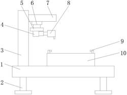 1.全自动胶鞋上胶机构,包括固定座(1),其特征在于:所述固定座(1)顶部的左侧固定连接有固定杆(3),所述固定杆(3)右侧的顶部固定连接有承载板(7),所述承载板(7)底部的左侧固定连接有第二气缸(6),所述第二气缸(6)的底部固定连接有固定板(5),所述固定板(5)底部的一侧固定连接有第四气缸(21),所述第四气缸(21)的一侧固定连接有第一气缸(4),所述第一气缸(4)的一侧固定连接有上胶机本体(8),所述固定座(1)顶部的右侧固定连接有放置台(10),所述放置台(10)内腔顶部的左侧固定连接有第三气缸(20),所述第三气缸(20)的右侧固定连接有滑杆(19),所述滑杆(19)的底部滑动连接有斜板(17),所述斜板(17)的底部固定连接有支撑板(18),所述支撑板(18)的两侧均固定连接有滑套(14),所述滑套(14)的内腔套设有滑动杆(15),所述滑套(14)的一侧固定连接有滑板(13),所述滑板(13)的顶部固定连接有限位夹杆(9)。2.根据权利要求1所述的全自动胶鞋上胶机构,其特征在于:所述固定座(1)底部的四周均固定连接有固定柱(2),所述固定柱(2)的底部固定连接有防滑垫。3.根据权利要求1所述的全自动胶鞋上胶机构,其特征在于:所述放置台(10)内腔的两侧均开设有第一滑槽(11),所述滑板(13)的一侧固定连接有第一滑块(12),且第一滑块(12)的表面滑动连接于第一滑槽(11)的内腔中。4.根据权利要求1所述的全自动胶鞋上胶机构,其特征在于:所述放置台(10)内腔顶部的中心处开设有第二滑槽,所述滑杆(19)的顶部固定连接有第二滑块,且第二滑块的表面滑动连接于第二滑槽的内腔中。5.根据权利要求1所述的全自动胶鞋上胶机构,其特征在于:所述支撑板(18)底部的两侧均固定连接有弹簧(16),所述弹簧(16)的底部固定连接有固定垫。6.根据权利要求1所述的全自动胶鞋上胶机构,其特征在于:所述固定板(5)内腔的底部开设有第三滑槽,所述第一气缸(4)的顶部固定连接有第三滑块,且第三滑块的表面滑动连接于第三滑槽的内腔中。