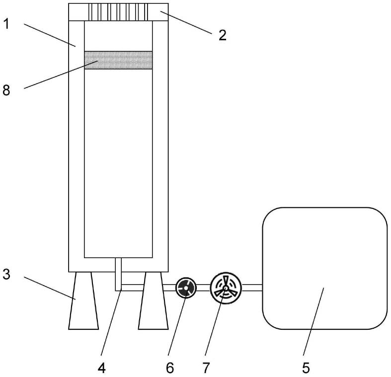 1.一种玻璃钢浮盘耐压测试装置,其特征在于,包括测试装置外壳(1)、测试装置顶盖(2)、支撑架(3)、不锈钢管线(4)、储液罐(5),所述测试装置外壳(1)顶部布置有连接接口(10),所述连接接口(10)与测试装置顶盖(2)螺纹连接,所述测试装置外壳(1)底部布置有支撑架(3),所述测试装置外壳(1)底部通过不锈钢管线(4)与储液罐(5)相连接,所述不锈钢管线(4)上布置有阀门(6)、增压泵(7),所述测试装置外壳(1)外壁布置有压力表(9),所述测试装置顶盖(2)内布置有透气孔(11)。