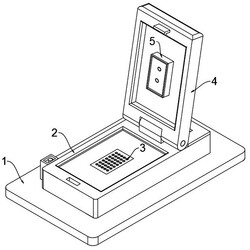 1.一种电子芯片检测治具,包括检测底板(1),所述检测底板(1)上设有检测基座(2),所述检测基座(2)上设有一组检测探针(3),其特征在于,所述检测基座(2)的一端设有翻盖(4),所述翻盖(4)的中部设有与检测探针(3)位置相对的吸附块(5),所述吸附块(5)的外侧设有缓冲组件(6),所述吸附块(5)的内部设有吸附腔(501),所述吸附腔(501)内设有多个伸出吸附块(5)并贯穿于缓冲组件(6)的抽气软管(502),所述检测基座(2)的一端设有微型真空泵(7),所述微型真空泵(7)的输出端通过连接软管(8)与吸附腔(501)连通。
