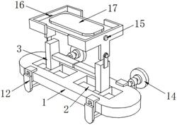 1.一种智慧购物商标智能标签的固定结构,包括固定结构本体(1),其特征在于:所述固定结构本体(1)的顶端开设有两个凹槽,两个所述凹槽的内部均固定安装有固定板(2),两个所述固定板(2)的一端部均活动套设有支撑板(3),两个所述支撑板(3)的顶端均转动安装有夹持架(4),两个所述夹持架(4)的中间位置处设有标签(17),所述固定结构本体(1)的背面卡合安装有两个第一夹持块(5),两个所述第一夹持块(5)的一侧均设有限位柱(6),两个所述限位柱(6)的一侧均穿插连接有伸缩柱(7),两个所述伸缩柱(7)的一端部均活动套设有辅助套筒(8),两个所述第一夹持块(5)的一侧分别与两个限位柱(6)的一侧固定连接,两个所述第一夹持块(5)设置的位置相对应,两个所述伸缩柱(7)的一端均活动铰接有真空吸盘(14),所述固定结构本体(1)的正面卡合安装有两个第二夹持块(10),两个所述辅助套筒(8)的底端均穿插连接有弧形块(9)。