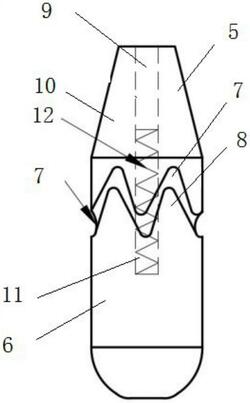 放电电极上体(5)和放电电极下体(6)通过两者之间对应设置的凹槽(7)和凸块(8)的相互嵌合而滑动连接;在放电电极上体(5)的中心位置,设置了顶杆孔(9),顶杆孔(9)的位置与顶杆(4)对应;在放电电极下体(6)的中心位置,设置了弹簧槽(11),弹簧槽(11)是盲孔,孔底设置弹簧(12),顶杆(4)的下端穿过顶杆孔(9)而压在弹簧(12)上;