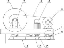 所述起重机主体包括底座(1)、支座(2)、卷筒(3)、起重电机(4)、减速机(5)及移动电机(6),所述底座(1)上表面的一端通过两个支座(2)设置有卷筒(3),所述底座(1)上模板的另一端设置有起重电机(4),所述底座(1)一侧设置有减速机(5),所述起重电机(4)的输出轴与减速机(5)的输入端相连,所述减速机(5)的输出端与卷筒(3)的中心轴相连,所述底座(1)下表面设置有若干滑块(7)及L型架(8),所述L型架(8)远离底座(1)一端均设置有支撑轮(9),所述底座(1)位于卷筒(3)处开设有通槽,所述底座(1)位于起重电机(4)和卷筒(3)之间且靠近起重电机(4)一端开设有安装孔,所述移动电机(6)设置于安装孔内,所述移动电机(6)的输出轴上安装有齿轮(10),所述齿轮(10)位于底座(1)下方;