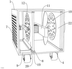 1.一种新风机进气端过滤装置,包括用于过滤空气的机箱(1),其特征在于:所述机箱(1)的一侧开设有多个进风孔(7),所述机箱(1)的另一侧设有出气管(5),所述机箱(1)内设有第一挡板(20)和第二挡板(22);所述第一挡板(20)和第二挡板(22)上分别嵌装有用于过滤空气的过滤网(12)和HEPA滤网(10),所述机箱(1)的后侧分别固定连接有固定板(11)和加固板(16),所述加固板(16)上设有用于清洁过滤网(12)灰尘的清洁机构,所述固定板(11)上设有用于吸风的吸风机构,所述出气管(5)内嵌装有活性炭过滤层(3),所述机箱(1)的后侧固定连接有用于控制设备的控制面板(6),所述机箱(1)的前侧设有推门(21),所述推门(21)的一侧设有门锁(2)。2.根据权利要求1所述的一种新风机进气端过滤装置,其特征在于,所述清洁机构包括有第二电机(15)、卡板(17)和毛刷(14),所述第二电机(15)的一侧与加固板(16)的一侧固定连接,所述第二电机(15)的输出端贯穿加固板(16)并与卡板(17)的一侧固定连接,所述卡板(17)的一侧开设有与毛刷(14)相适配的凹槽,所述毛刷(14)与凹槽相卡装,所述卡板(17)上设有螺栓。3.根据权利要求1所述的一种新风机进气端过滤装置,其特征在于,所述吸风机构包括有第一电机(13)和多个扇叶(18),所述第一电机(13)的一侧与固定板(11)的一侧固定连接,所述第一电机(13)的输出端上设有传动轴,多个扇叶(18)固定连接在传动轴上。4.根据权利要求1‑3任意一项所述的一种新风机进气端过滤装置,其特征在于,所述机箱(1)的顶部内壁和底部内壁均对称固定连接安装有滑轨(8),所述第一挡板(20)和第二挡板(22)的顶部和底部均固定连接有滑条(19),所述滑条(19)与滑轨(8)滑动连接。5.根据权利要求1所述的一种新风机进气端过滤装置,其特征在于,所述机箱(1)的底部内壁放置有用于收集灰尘的集尘盒(9),所述集尘盒(9)的一侧顶部固定连接有斜块,斜块与第一挡板(20)相贴合。6.根据权利要求1所述的一种新风机进气端过滤装置,其特征在于,所述机箱(1)的底部固定连接有用于机箱(1)移动的万向轮(4),所述万向轮(4)的数量为四个。