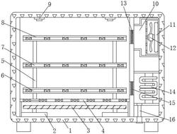 7.根据权利要求6所述的一种烘焙食品用防潮储存柜,其特征在于:所述冷却管(14)与外部电源电连接,所述进水口(15)设置在柜体(1)的下方,所述柜体(1)的内部固定连接有冷却室,所述冷却管(14)设置在冷却室的内部,所述出水管(16)通过冷却室与外部相连通。