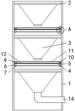1.一种润滑油生产用的过滤装置,包括防尘箱(1),所述防尘箱(1)包括壳体,所述壳体的正面活动安装有翻门,其特征在于:所述防尘箱(1)的内侧等距离固定连接有三个层板(2),三个所述层板(2)的内侧均放置有导料斗(3),所述防尘箱(1)的内侧装设有两个过滤组件,底部所述导料斗(3)的出料口外部固定连接有导液管(14);