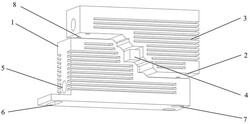 1.一种用于端面泵浦固体激光器的晶体热沉,由两个呈L型的晶体热沉拼接而成,拼接处可形成不同尺寸的孔,用于放置激光晶体(4),其特征在于:下L型晶体热沉(1)与上L型晶体热沉(2)的内部,沿水平方向贯穿设置有水道(5),下L型晶体热沉(1)与上L型晶体热沉(2)的表面且位于水道(5)的两侧分别设置有铲齿散热结构(3)。
