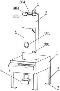 3.根据权利要求1所述的一种用于玉米淀粉加工用的干燥机,其特征在于:所述储料筒(2)的正面通过铰链铰接有卸料门(3),所述卸料门(3)的正面安装有锁紧开关(301),所述卸料门(3)的正面正面安装有观察窗(302),所述储料筒(2)的顶部设置有盖板(303),所述盖板(303)的顶部固定连接有进料管(304),所述盖板(303)的上表面螺纹连接有安装螺栓(305)。