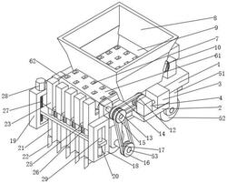 1.一种密度均匀的播种机,包括底座(1),其特征在于,所述底座(1)的前侧固定有安装板(2),所述安装板(2)的顶部从右到左依次固定有第一驱动电机(3)和减速机(4),所述第一驱动电机(3)的输出轴与减速机(4)的输入端固定,所述底座(1)的底部四端均固定有安装架(51),四个所述安装架(51)的底部均安装有滚轮(52),左侧两个所述滚轮(52)之间固定有转动轴(53),所述底座(1)的顶部右端转动连接有从动辊(63),所述底座(1)的顶部左端转动连接有主动辊(62),所述主动辊(62)与从动辊(63)之间传动连接有传送带(61),所述传送带(61)的外表面开设有多个凹槽(7),所述传送带(61)的上方设置有料仓(8),所述料仓(8)的底部与底座(1)的顶部固定,所述料仓(8)的右侧下端开设有放料口(9),所述料仓(8)的前侧右端插接有挡料板(10),所述料仓(8)的右侧固定有放料管道(11),所述减速机(4)的输出轴固定有第一皮带轮(12),所述主动辊(62)的前端贯穿底座(1)并从前到后依次固定有第三皮带轮(15)和第二皮带轮(13),所述第二皮带轮(13)与第一皮带轮(12)之间传动连接有第一皮带(14),所述转动轴(53)的前端贯穿安装架(51)并固定有第四皮带轮(16),所述第四皮带轮(16)与第三皮带轮(15)之间传动连接有第二皮带(17),所述底座(1)的左侧前端固定有第一支架(18),所述底座(1)的左侧后端固定有第二支架(19),所述底座(1)的左侧设置有移动板(20)和多个下料管道(21),所述移动板(20)的后端依次贯穿第一支架(18)和第二支架(19),所述移动板(20)的左侧后端和右侧后端分别与第二支架(19)的内壁左侧和内壁右侧滑动连接,所述移动板(20)的左侧前端和右侧前端分别与第一支架(18)的内壁左侧和内壁右侧滑动连接,多个所述下料管道(21)的顶部均贯穿移动板(20)并与其固定,多个所述下料管道(21)的左侧下端均固定有耕齿(22),多个所述下料管道(21)的顶部均插接有导料管道(23),多个所述导料管道(23)的内侧均固定有导料板(24),多个所述下料管道(21)的内壁右侧上端均开设有滑动槽(211)多个所述导料板(24)的左端分别与多个滑动槽(211)的内侧滑动连接,相邻两个所述导料管道(23)的下端固定有固定板(25),所述固定板(25)的底部固定有弹簧(26),所述弹簧(26)的底部与移动板(20)的顶部固定,所述第二支架(19)的内底壁转动连接有螺柱(27),所述螺柱(27)的顶部贯穿移动板(20)并与其螺纹连接,所述第二支架(19)的顶部固定有第二驱动电机(28),所述第二驱动电机(28)的输出轴与螺柱(27)的顶部固定,所述第一支架(18)的内侧固定有导向柱(29),所述导向柱(29)与移动板(20)插接,四个所述安装架(51)之间固定有放置板(30)。