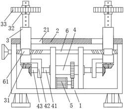 1.一种螺旋波纹管推送装置,包括底箱(1)和安装在底箱(1)上的顶板(2),其特征是,所述顶板(2)的顶部开设有两个滑槽(21),每个所述滑槽(21)的内部均滑动连接有活动块(3),每个所述活动块(3)的内部均转动连接有驱动转杆(31),每个所述驱动转杆(31)上均滑动连接有套管(32),每个所述套管(32)上均固定连接有套管(32),所述套管(32)上设有限制套管(32)在驱动转杆(31)上滑动的固定机构,所述底箱(1)的内部设有控制两个推送齿轮(33)之间距离的调节机构,所述底箱(1)的内部设有控制两个驱动转杆(31)同时转动的驱动机构。