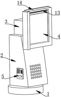 1.一种酒店前台用旅客自助服务机器人设备,其特征在于:包括底座(1),所述底座(1)上表面固定安装有机器人本体(2),所述机器人本体(2)顶部固定安装有保护壳(3),所述保护壳(3)一侧固定安装有触摸屏显示器(4),所述机器人本体(2)一侧固定安装有开关按钮(5),所述保护壳(3)内转动连接有齿轮一(6),所述保护壳(3)一侧固定安装有第一电机(7),所述第一电机(7)输出端固定安装在所述齿轮一(6)上,所述保护壳(3)内转动连接有异形块(8),所述异形块(8)外侧固定安装有齿牙一(9),且所述齿牙一(9)和所述齿轮一(6)相啮合,且所述异形块(8)一侧固定安装在所述触摸屏显示器(4)上,所述触摸屏显示器(4)一侧开设有滑槽(10),所述滑槽(10)内滑动连接有滑动块(11),且所述滑动块(11)内为中空,所述滑动块(11)内转动连接有齿轮二(12),所述滑槽(10)底部固定安装有齿牙二(13),且所述齿牙二(13)和所述齿轮二(12)相啮合;