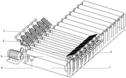 4.如权利要求1所述的一种激光切割床用金属板架床,其特征在于:所述输送机构包括支撑柱、滚筒、链轮、链条、电机、联轴器,所述底架沿长度方向设置有多组支撑柱,所述支撑柱上分别设置有转轴,所述转轴连接有滚筒和链轮,不同链轮之间通过链条传动连接,所述电机动力输出轴通过联轴器连接转轴。