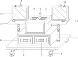 1.趣味型竞赛装置,其特征在于,包括底板(1),所述底板(1)的底部四角处设有移动轮(2),所述底板(1)的顶部中心处固定连接有储物箱(3),所述储物箱(3)的顶部设有竞赛题箱(5),所述储物箱(3)的两侧对称设有伸缩支杆(11),所述伸缩支杆(11)的一端与所述底板(1)的顶壁固定连接,另一端固定连接有支撑板(12),所述支撑板(12)的顶壁后侧固定连接有答题板(13),所述支撑板(12)的顶部一侧设有控制开关(14),所述答题板(13)的顶部设有指示灯(15),所述指示灯(15)的一侧设有蜂鸣器(16)。
