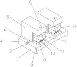 1.一种竹制品自动钉卡机,包括基座(1),其特征在于:所述基座(1)顶部中间开设有第一滑槽(2),所述第一滑槽(2)内部安装有滑块,滑块的顶部连接有钉卡机本体(5),所述钉卡机本体(5)包括下压出钉板(7)、出钉槽(14)和放置板(8),所述放置板(8)安装在钉卡机本体(5)内腔底部,所述放置板(8)后侧顶部左右端安装有固定件,固定件之间安装有固定杆,所述出钉槽(14)后侧下端套装在固定杆上,所述出钉槽(14)后侧通过长杆与下压出钉板(7)后侧活动连接,所述基座(1)左右侧中间均安装有第一压缸(3),所述第一压缸(3)右侧活动连接有第一伸缩杆(4)。