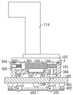 5.如权利要求2所述的提升机用旋转底座,其特征在于:所述固定装置(400)包括均匀间隔设置在所述底板(100)底部的四个伸缩电机(401),所述伸缩电机(401)的下端连接固定环(402)。