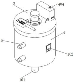 所述筒盖(2)的顶部安装有水箱(4),所述水箱(4)的输出端安装有电磁阀(402),所述电磁阀(402)的输出端安装有传输管(403),且传输管(403)的一端贯穿筒盖(2)的底部,所述搅拌桶(1)的一侧安装有多个第一气缸(5),所述第一气缸(5)的输出端安装有安装板(501),且安装板(501)位于搅拌桶(1)的内部,所述安装板(501)的顶部安装有湿度传感器(502)。