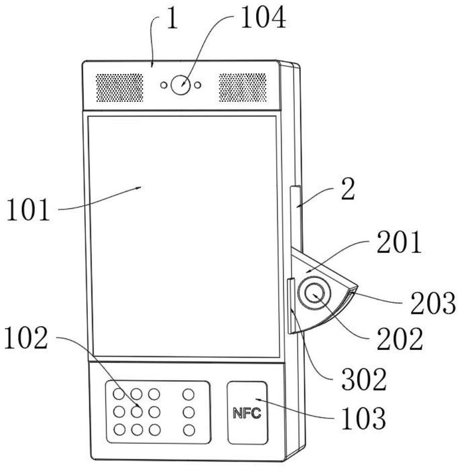1.一种翻转式人脸识别门禁终端,包括终端主体(1),其特征在于,所述终端主体(1)的正面中间位置处固定安装有触控屏(101),所述终端主体(1)的正面固定安装有设置在触控屏(101)下方按键区(102)和NFC感应区(103),所述终端主体(1)的右端壁中间位置处开设有收纳仓(2),且收纳仓(2)的内部转动安装有旋转座(201),所述旋转座(201)上固定安装有用于对到访人员人脸识别的摄像头(202),所述旋转座(201)的侧端壁上开设有齿槽(203),所述终端主体(1)的内部开设有与收纳仓(2)相连通的齿仓(204),且齿仓(204)的内部转动安装有与齿槽(203)相啮合的齿轮(205),所述终端主体(1)的内部固定安装有用于驱动齿轮(205)旋转的伺服电机,所述终端主体(1)的内部安装有处理器,所述触控屏(101)、按键区(102)、NFC感应区(103)、摄像头(202)以及伺服电机均通过导线与处理器电信连接。