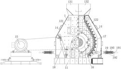 3.根据权利要求1所述的可逆反击式破碎机,其特征在于:所述调整机构(19)包括调整螺杆(191)、调整螺母(192)和调整弹簧(193),所述调整螺杆(191)与左机架(121)或右机架(122)贯穿,且调整螺杆(191)与反击架(17)铰接,所述调整弹簧(193)的两端各与一个调整螺母(192)抵接,所述调整弹簧(193)和调整螺母(192)均套装在调整螺杆(191)上,其中一个调整螺母(192)与左机架(121)或右机架(122)接触。