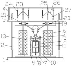 1.一种装配式建筑墙体结构,包括底座(1)和挡板(3),底座(1)上对称设置有两个挡板(3),挡板(3)的顶部固定安装有立柱(2),其特征在于,立柱(2)的顶部延伸至用于增强墙体强度的强化腔(4),强化腔(4)内设置有增强组件,强化腔(4)的底部固定在水平横板(5)上,底座(1)的中部设置有用于保护强化腔(4)的缓冲组件。
