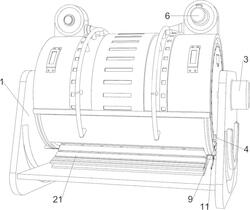 5.按照权利要求1所述的一种搅动式色母粒加工用干燥机,其特征是,还包括有用于推出卡在滚筒(2)和下料板(21)上的卡槽内的色母粒的推出机构(11),推出机构(11)包括有第二刮板(111)和把手(112),防护外框(61)右下部卡接有用于推出卡在滚筒(2)和下料板(21)上的卡槽内的色母粒的第二刮板(111),第二刮板(111)中部连接有把手(112)。