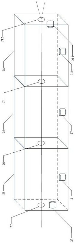 3.根据权利要求1所述的穆勒矩阵同步测量系统,其特征在于,所述多层海雾箱包括第一海雾箱(21)、第二海雾箱(25)和第三海雾箱(28),所述第一海雾箱(21)、第二海雾箱(25)和第三海雾箱(28)中分别设有第一海雾发生器(24)、第二海雾发生器(27)和第三海雾发生器(210),用于将海水进行超声波雾化产生海雾粒子;所述多层海雾箱上设有光学窗口,偏振光依次通过第一光学窗口(22)、第二光学窗口(26)、第三光学窗口(29)和第四光学窗口(212)进行传输。
