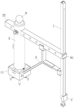 3.根据权利要求1所述的一种河道水位检测装置,其特征在于:所述水位滑架(1)的内部滑动连接有滑动板(4);所述滑动板(4)的底端固接有压板(41);所述压板(41)的底端固接有二号锥形插杆(42)。