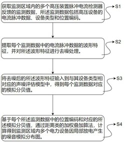 3.根据权利要求1所述的电力设备局部放电脉冲信号监测方法,其特征在于,所述计算得到监测区域内多个电力设备因局部放电产生的噪音模拟分布图之后,还包括:基于所述噪音模拟分布图评估噪音等级,并在所述噪音等级大于预设最大噪音阈值的情况下,基于监测区域内的多个高压装置的连接布局图和所述噪音模拟分布图,通过蚁群算法分析得到最优电力调度方案和在最优电力调度方案下的噪音模拟分布图,所述连接布局图反应当前监测区域内的多个高压装置之间的连接关系、电流和电压值;
