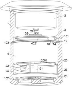 除湿构件:所述套筒(1)的内部位于盘型架(3)和托板(20)之间转动连接有旋筒(4),所述旋筒(4)中嵌放有三个吸水滤条(8),所述旋筒(4)的内部竖向滑动有三个配合吸水滤条(8)托放的扇形板(7),所述旋筒(4)的内部设置有同轴分布的轴柱(5),所述轴柱(5)与旋筒(4)之间固设有配合三个吸水滤条(8)分隔的隔板(6);