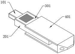 1.一种用于计算机软件保护的加密装置,包括USB接口(101)、底座(201)、顶盖(301)和两个保护板(401),所述USB接口(101)一端设置有PCB板(102),且PCB板(102)位于底座(201)和顶盖(301)之间,所述USB接口(101)通过底座(201)开口处延伸至底座(201)外部;