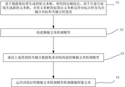 横幅文本检测网络模型包括特征提取模块、特征融合模块、回归模块和文本框生成模块;特征提取模块,用于提取输入图像不同层次的特征信息,得到从低层到高层的包含语义信息的特征图像;特征融合模块,用于将不同层次的特征图像进行合并,得到融合的特征图像,用于后续对横幅文本检测;回归模块,包括形状回归和关键点回归,形状回归基于融合特征图得到文本与背景分离的文本形状二值图,关键点回归基于融合特征图得到关键点坐标和宽度;文本框生成模块,用于基于回归模块输出的当前图像中的关键点坐标和宽度信息,生成横幅图像文本框;