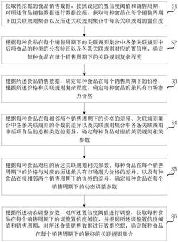 所述关联规则相关参数包括食品关联规则改变系数和食品种类规则改变系数,所述食品关联规则改变系数和食品种类规则改变系数对应的计算公式为:其中,和分别表示第n种食品对应的食品关联规则改变系数和食品种类规则改变系数,表示第n种食品在第t个销售周期下的关联规则集合中各条关联规则的总个数,和分别表示第n 种食品在第t个和第t‑1个销售周期下的价格,和分别表示第n种食品在第t个和第t‑1个销售周期下的关联规则集合中所有后项食品的总种类数,T表示第n种食品对应的销售周期的总数目,| |表示取绝对值符号,e表示自然常数;