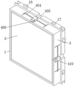 1.用于减少公共建筑全生命周期碳排放量的光伏幕墙,其特征在于,包括安装架(1),所述安装架(1)通过螺栓安装在墙体(2)上,所述安装架(1)上固定连接有导热框(3),所述导热框(3)上安装有自适应调节组件(4),所述导热框(3)通过自适应调节组件(4)连接有光伏幕墙本体(5),所述安装架(1)内固定连接有连接框(6),所述连接框(6)上固定连接有隔温玻璃(7),所述连接框(6)上安装有通风防护组件(8),所述连接框(6)内固定连接有收纳框(9),所述收纳框(9)内固定连接有限位框(10),所述限位框(10)内固定连接有涡卷弹簧(11),所述涡卷弹簧(11)的内端固定连接有转动轴(12),所述转动轴(12)的端部转动连接在限位框(10)内,所述转动轴(12)上缠绕有遮光布(13),所述遮光布(13)贯穿设置在收纳框(9)内,所述遮光布(13)的端部固定连接有托板(14),所述收纳框(9)上固定连接有定位板(15),所述安装架(1)上固定连接有拼接块(16),所述安装架(1)上开设有拼接槽(17),所述自适应调节组件(4)包括导向槽(401),所述导向槽(401)开设在导热框(3)内,所述导热框(3)内部一侧固定连接有橡胶气囊(402),所述橡胶气囊(402)内部一侧固定连接有光敏合金(403),所述光敏合金(403)的另一端与橡胶气囊(402)内部另一侧相贴合,所述橡胶气囊(402)的侧端面上固定连接有导向杆(404),所述导向杆(404)限位滑动连接在导向槽(401)内,所述导向杆(404)的端部固定连接有衔接板(405),所述衔接板(405)与导热框(3)相贴合,所述导向槽(401)设置有四组,每组导向槽(401)设置有两个,四组导向槽(401)等角度分布在导热框(3)内,两个导向槽(401)对称分布在衔接板(405)的两侧,所述导向槽(401)与导向杆(404)一一对应,所述光敏合金(403)对称分布在橡胶气囊(402)内部两侧,所述光敏合金(403)呈连续“S”形,所述衔接板(405)上贯穿开设有定位槽(406),所述衔接板(405)的侧端固定连接有复位弹簧(407),所述复位弹簧(407)的另一端固定连接有卡杆(408),所述复位弹簧(407)套设在卡杆(408)上,所述卡杆(408)滑动连接在衔接板(405)内,所述卡杆(408)的端部卡合连接在卡槽(409)内,所述卡槽(409)开设在定位块(410)上,所述复位弹簧(407)对称分布在衔接板(405)的两侧,所述复位弹簧(407)通过卡杆(408)与卡槽(409)一一对应,所述定位块(410)卡合连接在定位槽(406)内,所述定位块(410)的顶端面与衔接板(405)的顶端面平齐,所述定位块(410)的底端面上转动连接有伸缩套杆(411),所述定位块(410)的底端面上固定连接有橡胶套筒(412),所述伸缩套杆(411)的底端铰接在光伏幕墙本体(5)上,所述橡胶套筒(412)的另一端固定连接在光伏幕墙本体(5)上,所述橡胶套筒(412)套设在伸缩套杆(411)上,所述橡胶套筒(412)滑动连接在导热框(3)内,所述伸缩套杆(411)连接在定位块(410)的底端中间部位,所述伸缩套杆(411)连接在光伏幕墙本体(5)的端部中间部位,所述伸缩套杆(411)等角度分布在光伏幕墙本体(5)上,所述橡胶套筒(412)的内径大于伸缩套杆(411)的直径。
