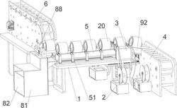 1.一种马达定子自动扎带机,包括有支架(1)、扎带机(2)、电动滑块(22)和连接架(3),支架(1)前后方各安装有多台扎带机(2),扎带机(2)包括扎带器(21),支架(1)顶部连接有两个连接架(3),连接架(3)顶部均安装有两个可自动前后移动的电动滑块(22),电动滑块(22)分别与扎带器(21)固定连接,其特征是:还包括有出料输送机(4)、电动移动座(5)、分隔组件、上料输送机(6)、限位机构、定位机构和卸料机构,支架(1)顶部安装有可自动左右移动的电动移动座(5),电动移动座(5)顶部开有用于放置定子(20)的凹槽,通过分隔组件对电动移动座(5)上的定子(20)进行分隔,支架(1)右方设有出料输送机(4),支架(1)左后方设有上料输送机(6),上料输送机(6)包括两块侧板和输送带,两块侧板上均开有导槽(61),输送带上间隔连接有多根凸杆,连接架(3)上设有用于对电动移动座(5)上最右侧定子(20)进行限位的限位机构,支架(1)左方设有定位机构,支架(1)右部设有卸料机构;限位机构包括有固定框(71)、滑动块(72)、限位杆(73)、传动块(74)、挤压块(75)和固定块(76),连接架(3)上部均连接有固定框(71),固定框(71)相互靠近的一侧上部均滑动连接有限位杆(73),限位杆(73)从固定框(71)侧面伸出以对扎带中的定子(20)进行限位,两根限位杆(73)相互远离的一端均连接有通过压缩弹簧复位的滑动块(72),固定框(71)内部均滑动连接有传动块(74),固定框(71)内部下侧均滑动连接有从固定框(71)侧面伸出的挤压块(75),电动移动座(5)右端前后两侧均连接有固定块(76),滑动块(72)和传动块(74)相互靠近的一侧均设有斜面一,滑动块(72)和传动块(74)通过斜面一相互抵接,传动块(74)和挤压块(75)相互靠近的一侧均设有斜面二,传动块(74)和挤压块(75)通过斜面二相互抵接,固定块(76)抵接于挤压块(75),固定块(76)右侧均设有斜面三,固定块(76)通过斜面三使挤压块(75)往固定框(71)内部缩进;定位机构包括有定位杆(201)、连接框(81)、收集框(82)、导料斗(83)、托杆(84)、双向螺杆(85)、齿轮(86)、齿块(87)和电磁铁(88),上料输送机(6)上的定子(20)上部贯穿设有定位杆(201),定位杆(201)两端分别位于两个导槽(61)内,支架(1)左方设有连接框(81),连接框(81)内部放置有用于收集定位杆(201)的收集框(82),连接框(81)中部连接有倾斜设置的导料斗(83),连接框(81)上部滑动连接有两根托杆(84),连接框(81)上部转动连接有与托杆(84)螺纹连接的双向螺杆(85),双向螺杆(85)中部连接有齿轮(86),连接框(81)上部滑动连接有通过回力弹簧复位的齿块(87),齿块(87)与齿轮(86)啮合,电动移动座(5)左移会与齿块(87)接触,连接框(81)顶部安装有电磁铁(88),定位杆(201)均为铁磁性材质,电磁铁(88)通电能吸住定位杆(201),双向螺杆(85)转动时两根托杆(84)运动方向相反。