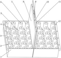 1.一种农业产品包装盒,包括三岔牛皮纸板(11)和两个盒体(1),其特征在于,所述三岔牛皮纸板(11)的下端一体成型设有与盒体(1)等高的两个牛皮纸板,且两个牛皮纸板的两侧分别固定连接有盒体(1),所述盒体(1)的底部粘接有发泡橡胶板(4),所述发泡橡胶板(4)的上端面通过活动连接装置连接有若干隔开农产品的气囊(7),所述三岔牛皮纸板(11)位于上端的左右两端面均粘接有与盒体(1)相配合的海绵(8),所述盒体(1)的外侧设有固定连接装置,所述三岔牛皮纸板(11)的顶部开设有把手槽(9)。