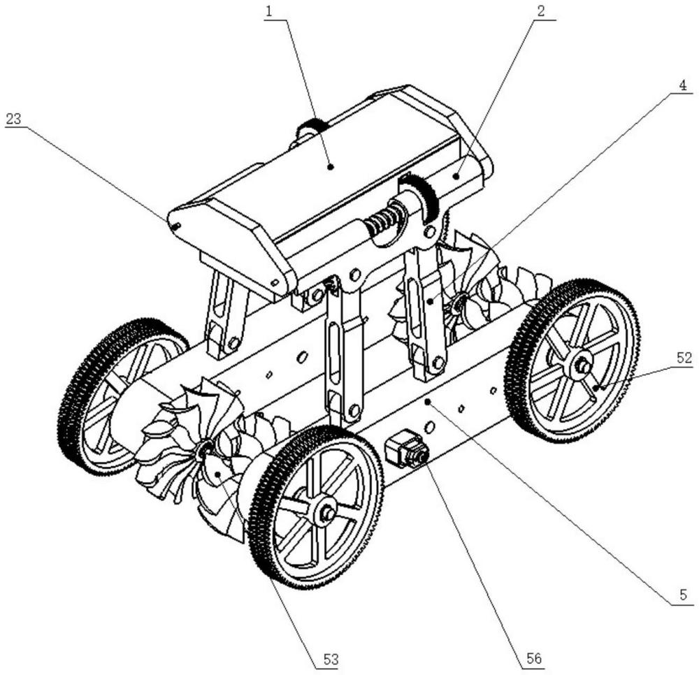 5.根据权利要求4所述的一种水陆两栖特种作业机器人,其特征在于:所述长齿轮轴与行走轮之间通过平键一连接,长齿轮轴伸出行走轮处设置有挡圈;所述长齿轮轴与叶轮之间通过平键二连接,长齿轮轴伸出叶轮处设置有挡圈;所述长齿轮轴与圆柱齿轮之间通过平键三连接,长齿轮轴与圆柱齿轮轴连接位置的两端均设置有支撑长齿轮轴旋转,降低运动过程中的摩擦系数,并保证回转精度的轴承,所述轴承的外侧均设置有用于定位的轴承盖。