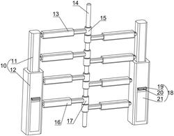 1.一种市政道桥施工用隔离护栏,包括两个伸缩支撑组件(10),其特征在于:两个所述伸缩支撑组件(10)包括支撑滑块(12),两个所述支撑滑块(12)的内部上侧滑动设有支撑底座(11),两个所述支撑底座(11)的中间设有支撑柱(14),两个所述支撑底座(11)与同一个支撑柱(14)之间连接且上下间隔设有多个第一伸缩杆(13),两个所述支撑滑块(12)与同一个支撑柱(14)之间连接且上下间隔设有多个第二伸缩杆(16)。