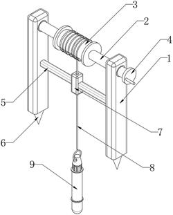 1.一种地下水取样装置,包括取样瓶(9)以及两个支架(1),其特征在于:两个支架(1)之间安装有收放组件,取样瓶(9)包括悬吊盖(901),悬吊盖(901)的顶部设置有悬吊环(905),悬吊盖(901)的底部固定连接有卡杆(904)和多个等距对称设置的支撑条(902),多个支撑条(902)的底部共同固定连接有第一螺纹筒(903),第一螺纹筒(903)的外围螺纹套设有储水筒(915),储水筒(915)的内壁滑动连接有滑块(906),储水筒(915)的内壁固定连接有支撑板(908)、过滤板(909)以及取水管(911),支撑板(908)和滑块(906)之间固定连接有多个弹簧(907),取水管(911)的底部内壁转动连接有密封阀门(912),密封阀门(912)的一侧固定连接有阀门把手(913),且阀门把手(913)贯穿式转动插接在取水管(911)的外围,储水筒(915)的底部固定连接有第二螺纹筒(910),第二螺纹筒(910)的外围螺纹套设有配重块(914),所述收放组件通过麻绳(8)与悬吊环(905)相连接。