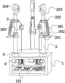 1.一种约束欠驱动组件,包括箱体(1)、支杆(2)和动力机构(4),其特征在于:所述箱体(1)顶部固定安装有三组支杆(2),所述支杆(2)顶部固定安装有连接轴件(201),所述连接轴件(201)通过轴栓安装有欠驱动夹杆(202),所述欠驱动夹杆(202)顶端一侧固定安装有压力传感器(203),所述压力传感器(203)一侧固定安装有夹板(204),所述欠驱动夹杆(202)外侧活动安装有滑套座(3),所述滑套座(3)一侧固定安装有约束弹簧(301),所述约束弹簧(301)底部固定安装有连接件(302),且连接件(302)固定安装在连接轴件(201)一侧,所述箱体(1)内部固定安装有动力机构(4),所述动力机构(4)包括安装架(401),所述安装架(401)内侧转动安装有放线辊(402),所述放线辊(402)外侧盘绕安装有线缆(403)。