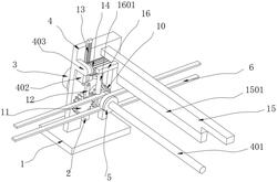 5.根据权利要求1所述的一种玻璃输送台,其特征在于:所述可以来回运动的清理机构包括支架(15),所述支架(15)滑动设置在安装架(4)和第二安装架(102)上,所述支架(15)一侧开设有齿槽,所述支架(15)啮合连接在长齿轮(14)另一端,所述支架(15)下方安装有毛刷(1501),所述毛刷(1501)和底座(1)间距有一面玻璃厚度。