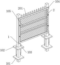 2.如权利要求1所述一种隔离栅,其特征在于:所述架体(1)上对称焊接有两个固定板(102),两个固定板(102)均为回字形板状结构,两个固定板(102)底端面均与地面接触,两个固定板(102)共同组成了架体(1)的第二防倾倒结构。