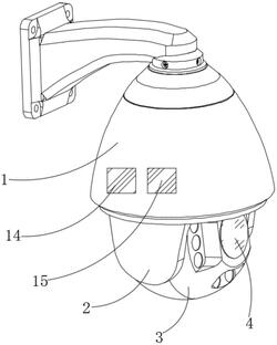 3.根据权利要求1所述的一种可调节角度的安防监控装置,其特征在于:所述壳体(1)内设置有用于对摄像头(4)进行角度调节的角度调节组件,所述角度调节组件包括转轴(8)、齿轮(9)、齿条(10)和气缸(11),所述转轴(8)转动设置在壳体(1)内且另一端与固定架(5)连接,所述齿轮(9)固定套接在转轴(8)上且与齿条(10)啮合连接,所述气缸(11)镶嵌在壳体(1)内且驱动端与齿条(10)连接。