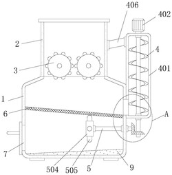 振动机构(5),设置于操作箱(1)的内部,所述振动机构(5)包括有第一锥齿轮(501)、第二锥齿轮(502)、第二转动杆(503)、圆柱块(504)和凸块(505),第一转动杆(403)的另一端延伸至回料箱(401)的外部,第一转动杆(403)的外壁固定安装有第一锥齿轮(501),操作箱(1)的一侧内壁转动安装有第二转动杆(503),第二转动杆(503)的一端延伸至操作箱(1)的外部,且固定安装有第二锥齿轮(502),第一锥齿轮(501)和第二锥齿轮(502)之间相啮合,第二转动杆(503)的另一端固定安装有圆柱块(504),圆柱块(504)的外壁固定安装有多组凸块(505)。
